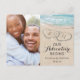 Tarjetas postales de guardar fecha de destino de playa con una foto de usted y su pareja, una playa de arena con dos corazones en la orilla, olas del océano azul de verano, sus iniciales y una plantilla de texto que es fácil de personalizar.