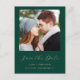 Esta simple y minimalista postal Save the Date muestra una foto cuadrada encima de las palabras "Save the Date" en un elegante guión de escritura a mano de color dorado, seguido por los nombres de la pareja, la fecha boda y la ciudad en letra sans serif en un fondo verde esmeralda. Agregue un mensaje más detallado con información adicional sobre el reverso, junto con su dirección de retorno y un código QR para ayudar a sus invitados a visitar el sitio web de su boda.
