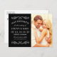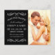 Tirantes decorativos y florituras enmarcan este elegante diseño de tarjeta postal de Save the Date de boda con inspiración vintage que incluye una foto en la parte delantera y trasera de la tarjeta. El diseño de dos caras incluye todos los detalles importantes para la próxima boda de la novia y el novio. Esquema de color en blanco y negro. El color de fondo negro en la parte delantera se puede personalizar.