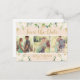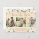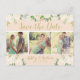 La tarjeta postal de salva la fecha de boda cuenta con tres (3) espacios para mostrar fotos de compromiso, enmarcadas por un diseño de acuarela floral y de verdor. Los colores de primavera y verano incluyen tonos neutros de blanco, crema, rosa claro, rosa dorado, dorado y verde. El texto suave negro coordinado se puede personalizar con todos los detalles importantes en la parte posterior de la tarjeta postal.