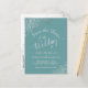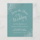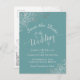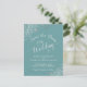 Esta hermosa postal está diseñada para dar a sus amigos y familiares aviso previo de su próximo boda. El diseño es sencillo pero elegante, con una caligrafía gris pálida y unos rizos de Relieve metalizado falsos de plata en las esquinas, con un fondo verde azulado, turquesa o acuático. La parte de atrás tiene un lindo gráfico de "lápiz en", así como espacio para un sitio web y otra información.