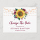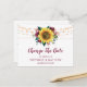 Estas tarjetas de cambio de fecha presentan un diseño rústico de girasol y rosa de Borgoña con luces de cuerda. Forman parte de una colección que incluye una gama completa de invitaciones de boda y papelería a juego. Por favor, visite nuestra tienda para ver la gama completa de artículos que puede personalizar para su boda.
