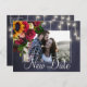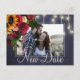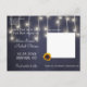 Girasoles amarillos dorados, rosas rojas borgoña, hilos de luces centelleantes y tipografía blanca en elegante pizarra de color azul marino oscuro de medianoche, nueva fecha pospuesta tarjeta postal de anuncio de boda. +++++++++ Fácil de personalizar con tus nombres y texto! ++++++++++ Adecuado para bodas temáticas de invierno floral, Navidad, finales de verano u otoño / jardín trasero rústico campo o granja.