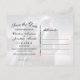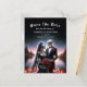 This gothic wedding save the date postcard announcement features a skeleton couple wearing a wedding attire with red roses and candles in a romantic setting in front of a lake at night with the moon in the background. The back of the postcard has the image of the skeleton couple and fill in your wedding details. Image generated with AI.