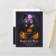 This vintage gothic wedding save the date postcard announcement features a skull candy skeleton couple wearing wedding attire with orange flowers and candles in a romantic setting. The back of the postcard has the image of the skeleton couple and fill in your wedding details. Image generated with AI.