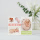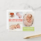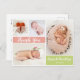 Moderno, Girly Coral y Green Gracias Anuncio de Nacimiento Bebé 4 Postales de Collage de fotos. Elegante y lindo formulario de anuncio de fotos con cuatro (4) de tus fotos favoritas de bebé con una escritura con letras a mano de bonito en blanco sobre bloques de color rojo y verde coral de luz pastel. Agrega el nombre de tu bebé, mensaje de agradecimiento y estadísticas de nacimiento. Fácilmente para personalizarlo.