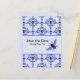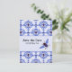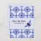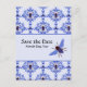 Tarjeta postal personalizable "guardar la fecha" con patrón de abeja bumble en damasco azul y franqueo a juego.
