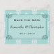 Una postal de guardar la fecha de boda muy elegante y personalizada en aqua / verde suave, parte del conjunto de papelería de boda ''Damasco verde'' que presenta un patrón de damasco verde claro y blanco con adorno verde.