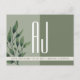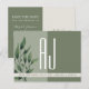 Tarjeta de anuncio de guardar la fecha de boda verde menta con tipografía rústica, elegante, simple y contemporánea, con iniciales de monograma gigante en la parte frontal, vegetación de acuarela y caligrafía moderna.