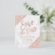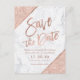 Tipografía en oro rosa sobre mármol blanco, bloque de color brillo en oro rosa y rayas geométricas en falso oro rosa, guardar la fecha de la boda chic, perfecto para una boda elegante y con estilo,