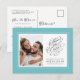 ¡Agrega tu foto de compromiso favorita y anuncia la fecha de tu próxima boda con nuestra clásica tarjeta postal de anuncio de boda "Save The Date" en azul aguamarina y blanco! El diseño presenta caligrafía chic y letra script en gris carbón sobre un fondo blanco crujiente colocado en un marco acuático acentuado por un delicado borde blanco. Personaliza el diseño de la boda en el frente con tu foto, nombres, ubicación y fecha en letra carbón y script. La parte trasera de la tarjeta coincide en blanco con script en carbón y tiene detalles adicionales que incluyen tu dirección de respuesta y sitio web u otro texto personalizado. Para obtener mejores resultados, recorta la foto con un editor de fotos primero y reemplaza el texto de la plantilla con tus detalles, luego sigue las instrucciones en el área de la plantilla. Si necesitas ayuda con este o alguno de nuestros diseños, envíanos un correo electrónico a invitationsuites@gmail.com. Se aceptan solicitudes personalizadas con gusto