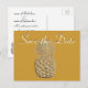 Esto ahorra el anuncio de la fecha para los bodas presenta una piña dorada en un fondo dorado. Este bonito ahorra la fecha postal puede ser una mezcla o un diseño de coincidencia con otros productos de planificación de bodas y artículos de papelería tropical o Hawaii. La piña es el símbolo de la hospitalidad.