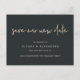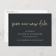 ¿Necesita cambiar la fecha de su boda? Notifique a los invitados con esta tarjeta postal moderna y ligera que presenta "guardar nuestra nueva fecha" en letras manuscritas de lámina de oro falso sobre un fondo negro suave y rico. Personalice con sus nombres y nueva fecha de boda debajo en letras blancas.