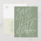 Haga saber a sus amigos y familiares la fecha de su próxima boda con esta tarjeta moderna y elegante escrita con pincel que presenta una tendencia verde salvia y tipografía elegante para un correo atractivo. ¡Envíenos un correo electrónico a hello@christiekelly.com para obtener asistencia gratuita con la personalización!