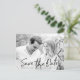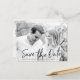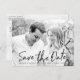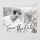 Bodas modernas y elegantes ahorran las postales de fecha con un superpuesto de escritura moderno negro, marcadores de posición para el texto personalizado y la foto de compromiso, y fondo de mármol blanco. La parte posterior de la tarjeta postal incluye la opción de texto personalizado o se puede dejar en blanco para un mensaje manuscrito.
