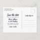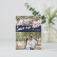 Bodas guardar la postal de fecha que puedes personalizar con cuatro de tus propias fotos, tres más pequeñas y una más grande. Guardar nuestra fecha se escribe diagonalmente a través de la postal en un guión blanco contra un fondo azul marino. Agregue sus nombres y la fecha del boda en una fuente limpia.