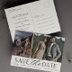 Una moderna tarjeta postal de guardar la fecha diseñada para acomodar dos fotos de compromiso alineadas lado a lado. "Guardar la fecha" aparece debajo de sus fotos en elegante letra de bloque y escritura, con sus nombres, fecha de la boda y ubicación de la boda debajo. Las postales se invierten para mostrar detalles adicionales de guardar la fecha, incluyendo su sitio web de boda, con su dirección de devolución y espacio para la dirección del destinatario.