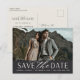 Una tarjeta postal moderna para guardar la fecha diseñada para acomodar tu foto de compromiso horizontal o paisajista favorita. "Guardar la fecha" aparece debajo de la foto en bloques blancos y letras de guiones, con sus nombres, fecha de boda y ubicación de boda debajo. Las postales se invierten para mostrar detalles adicionales de guardar la fecha, incluido el sitio web del boda, con la dirección de devolución y el espacio para la dirección del destinatario.