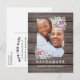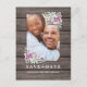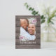 Tarjetas postales de estilo rústico campestre con fondo de granero de madera rústica, una foto de la novia y el novio, una exhibición floral de suculentas en la esquina y una plantilla de texto de boda fácil de personalizar.