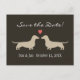 Siluetas de Dachshund con la tarjeta postal de invitación a la boda de Wiener Perro Personalizado en el Corazón. Una invitación divertida para una pareja comprometida a la que le encantan los perros. Personalice esta invitación de boda original con el nombre de la pareja feliz y la información del día de la boda. Visite el mundo doodle de Jenn para ver más productos de planificación boda con este diseño de Doxie y más invitaciones de bodas para razas de perros.