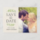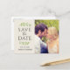 Simple y sereno, esta tarjeta postal de "save the date" presenta un diseño limpio dividido con una foto de la pareja a sangre junto a un panel de texto marfil suave decorado con acentos de ramas de laurel verde en acuarela encima y debajo de la tipografía serif en negrita. Los nombres de la pareja, la fecha y la ubicación se muestran en una elegante maquetación de fuentes mixtas. El reverso de la postal que se puede enviar incluye todos los detalles clave de la boda. Todo el texto y la foto son totalmente personalizables.