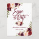 Letra de pincel moderna, floral acuarela borgoña marsala, tarjeta postal de compromiso de guardar la fecha