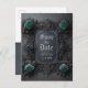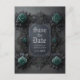 Esta boda gótica temática personalizada ahorra la fecha invitación postal con rosas azules verde azulados en un marco gris oscuro para la información de invitación de tu boda. En la parte posterior de la tarjeta postal encontrará más detalles de su boda para usted también para el personalizar. ¡Felicitaciones por tu compromiso! Diseñado por Susan Coffey. Imagen generada con IA.