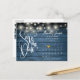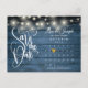Esta elegante tarjeta de salvar la fecha cuenta con bonitas luces de cadena, un calendario y un corazón de amor dorado destacando su fecha especial en un fondo de madera rústica azul.