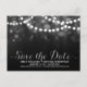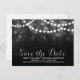 Elegantes luces de cadena brillantes sobre un fondo bokeh plateado en blanco y negro romántico. Tarjeta para guardar la fecha. Este hermoso diseño de luces bokeh de aspecto moderno está disponible en muchos colores diferentes y puede solicitar cualquier color de este diseño por correo electrónico. O contácteme para cualquier soporte en personalización de diseño. Productos coincidentes disponibles