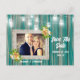 Un hermoso fondo de madera falsa con azul de caliza tiene un gran marco de foto blanco con borde ornamentado con girasoles y luces de cuerda de frasco de mason en el borde superior que parecen brillar y relucir. Las plantillas de letra script para el nombre de la pareja y el anuncio de boda | compromiso aparecen en el borde inferior y a la derecha de la foto.
