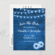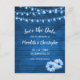 Tarjetas de guardar la fecha de la boda rústicas de tono azul que presentan fondo de foto de madera con una cadena de luces brillantes y margaritas. Mezcle y combine esta tarjeta de guardar la fecha de la boda con nuestra colección de papelería y favores de boda a juego.