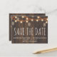 Tarjeta Postal de Anuncio de Fecha para Guardar con Luces de Otoño Rústicas y Hojas - con luces de tarro de mason llenas de luciérnagas titilantes con guirnalda de hojas en un fondo de madera de granero. El anuncio perfecto para la Fecha para Guardar para la pareja que ama el estilo rústico. La Fecha para Guardar será parte de una colección.