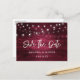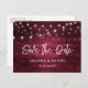 Tarjeta postal de guardar la fecha de boda rústica de Borgoña con madera rústica adornada con luces de cuerda.