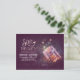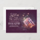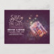 Tarjeta postal especial y morada para guardar la fecha con un hermoso y caprichoso frasco de mason con luces brillantes - luciérnagas. Una moderna y vintage manera de guardar la fecha perfecta para temas de boda rústicos y campestres.