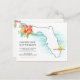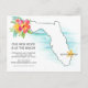 Mapa de Florida con olas del océano y flores tropicales Tarjeta postal de anuncio de nueva dirección... Nuestra tarjeta postal de mapa de Florida con nueva dirección muestra actualmente la ubicación de una conocida playa de Florida en la costa este del estado. Si te mudas a un lugar diferente en Florida, puedes mover fácilmente la pequeña estrella de mar que indica la ciudad a cualquier área del mapa... solo haz clic en PERSONALIZAR y luego EDITAR CON HERRAMIENTA DE DISEÑO donde puedes arrastrar la pequeña estrella de mar a la ubicación de tu nuevo hogar. También puedes arrastrar el marcador de texto del nombre de la ciudad a la misma ubicación... y seguir utilizando la plantilla de personalización para cambiar el nombre de tu feliz lugar de playa. Todo el texto en la parte delantera y trasera de la tarjeta se puede personalizar fácilmente con tu propia información.