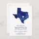 envíe su nueva dirección a amigos y familiares con este moderno mapa de acuarela azul marino del estado de texas con tipografía moderna. Invitación móvil perfecta. Mueva el corazón a su ubicación.