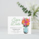 Mason Jar de Margaritas de Gerber Save the Date: Perfecto para una boda de estilo campestre o tal vez simplemente te gustan los Mason Jars. Mason Jar Azul Vintage con Margaritas de Gerber Naranjas, margaritas miniatura fucsias y verduras. Para consultas sobre cambios de diseño personalizado por el diseñador independiente, por favor envíe un correo electrónico a paula@labellarue.com ANTES de personalizar o realizar un pedido.