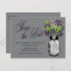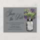 Mason Jar Salva la Fecha: Perfecto para un boda de estilo rural o tal vez te encanta Mason Jars! Vieja cosecha Mason Jar con flores silvestres Proep Purple y Lime Green. Se ha fijado un fondo gris. Si tiene alguna pregunta sobre este diseño o desea cambiar de color, por favor envíeme un correo electrónico a paula@labellarue.com