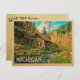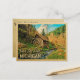 Viñeta Michigan Guardar la postal de la fecha en un divertido estilo retro de mediados de siglo. Cuenta con un paisaje rústico de naturaleza arbolada, con una cabaña de madera y un molino de noria, y un arroyo de riachuelo de bonito con hojas de otoño para un ambiente otoñal o de fin de verano. Esta postal de Michigan Save The Date será perfecta para una boda de campo o naturaleza y para un boda de camping.