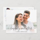 Postal de invitación de compromiso con la moda que muestra tu foto con "felizmente siempre después" en un guión elegante con toques y tus nombres unidos con un corazón. En la parte posterior, agregue una foto adicional, personalice su mensaje y agregue sus nombres en un script tipo firma.