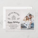 ¡Nos hemos mudado! Cambio festivo y moderno de postal de dirección con un lindo ilustracion de casa de jengibre y un diseño de caligrafía de escritura leyendo FESTIVOS FELICES, así como tu foto personalizado de ti en tu nueva casa en un fondo de shiplap de madera blanca. Personalice con un mensaje personalizado en la parte trasera de esta elegante y rústica invitación.