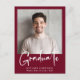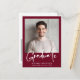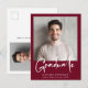 Postal moderna de invitación de graduación en rojo burdeos con tu foto y "Graduado" en un elegante y audaz guión en blanco. Añada el nombre del graduado, el año escolar y el año de clase en una simple tipografía blanca. Al revés, agregue una foto adicional y un mensaje personalizado, o deje en blanco.