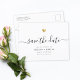 Esta elegante tarjeta Save the Date brilla con sencillez. Tipografía moderna, caligrafía magnífica y acentuado por un corazón dulce con oro impreso.