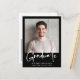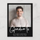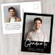 Postal de invitación negra de graduación moderna con tu foto y "Graduado" en un audaz guión blanco. Añada el nombre del graduado, el año escolar y el año de clase en una simple tipografía blanca. Al revés, agregue una foto adicional y un mensaje personalizado, o deje en blanco.
