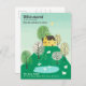 Ilustración linda y adorable de una casa amarilla en el campo en la parte superior de la colina con mucha hierba verde, árboles y un lago cercano con cisnes, rodeada de ovejas pastando. La parte posterior de la postal presenta tu mensaje personalizable para tu familia y amigos, en tipografía de carbón.