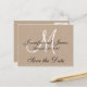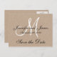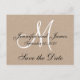 Elegante tarjeta postal Monogram Rústico Save the Date. Elke Clarke© para MonogramGallery en Zazzle. Anuncio de boda moderno y simple con efecto de foto en papel kraft beige impreso. Una inicial de monograma blanco en tipografía script con texto negro superpuesto. Totalmente personalizable. Otros colores y efectos de fondo disponibles.