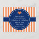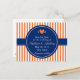 El diseño presenta un patrón de rayas alternas naranjas y blancas en el fondo. Además, el diseño presenta las iniciales de la novia y el novio separadas por un corazón naranja. Un elegante patrón de rayas y en el medio hay un círculo azul real donde agregar su texto. Tarjetas postales de boda para guardar la fecha.