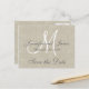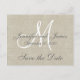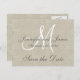 Elegante Monograma Linen Guardar la postal de fecha. Elke Clarke© para MonogramGallery en Zazzle. Invitación boda moderna y sencilla con efecto fotográfico impreso de ropa de cama beige. Un monograma blanco inicial en la tipografía del guión con superposición de texto gris. Personalizable completo. Hay otros colores y efectos de fondo disponibles.