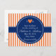El diseño presenta un patrón de rayas alternas naranja y blanco en el fondo. Además, el diseño presenta las iniciales de la novia y el novio separadas por un corazón naranja. Un patrón de rayas elegante y en el medio hay un círculo azul real donde agregar su texto. Tarjetas postales de boda para guardar la fecha.