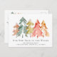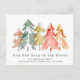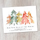 Postal de invitación móvil simple y elegante con un hermoso bosque acuático de pinos abstractos en verde, rojo, dorado y naranja. En el frente, personaliza el texto "Nuestro Nuevo Cuello del Bosque", tu nombre de familia y tu nueva dirección. Al revés, puede personalizar su invitación con más detalle e incluir números de teléfono y direcciones de correo electrónico si lo desea.